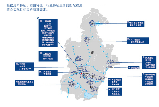 网龙wifi手机广告,截至目前已经覆盖天津市51家三甲医院,高档酒店60家,商场购物中心49家,大中专院校22家,旅游景点9家,政府服务窗口10家,天津机场1家,每天触达50-60万人主流消费人群,目标场景精准,成功打造出天津最大的WIFI手机广告公司。